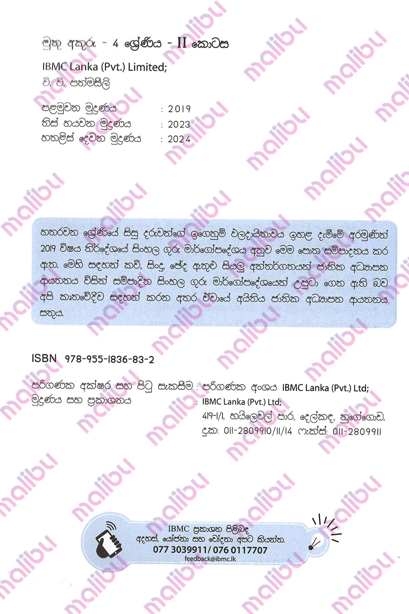 - හතරවන ශ්රේණියේ සිසු දරුවන්ගේ ඉගෙනුම් ඵලදායිතාවය ඉහළ දැමීමේ අරමුණින් 2019 නව විෂය නිර්දේශයේ සිංහල ගුරු මාර්ගෝපදේශයට අනුව කොටස් දෙකක් සම්පාදනය කර ඇත. මෙය ඉන් දෙවන කොටසයි.