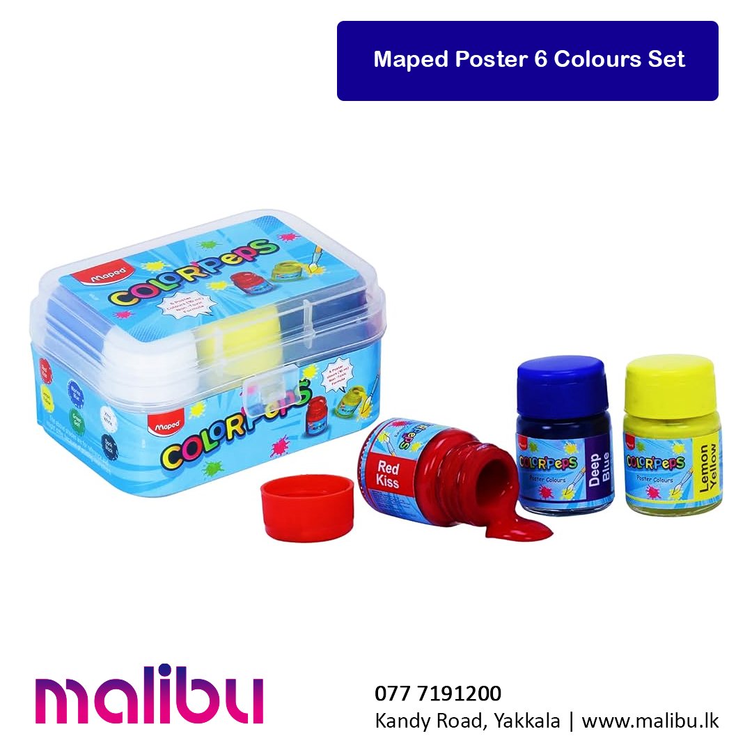 Maped poster colour 6 / 12 Shade and are rich vibrant colours. * It is opaque and water-based that is suitable for use on posters. * This paint does not contain oil and is used for painting pictures. * These paints can be used for school artwork, at home, young artists for painting and shading. * They are a smooth colour flow and bring life to any painting. * 10 ml (Pack of 6 & 12)